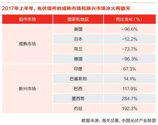 海外市場(chǎng):兩處明顯變化值得注意。一是從總體上來(lái)看,無(wú)論是硅片、電池片還是組件,中國(guó)企業(yè)的出口量都維持著高速增長(zhǎng),然而其出口額卻明顯同比下降,這說明光伏組件的出口是在以量補(bǔ)價(jià),平均外銷價(jià)格要比去年低的多。二是從局部來(lái)看,國(guó)際市場(chǎng)結(jié)構(gòu)出現(xiàn)了明顯的變化,其中包括美國(guó)、德國(guó)、日本在內(nèi)的成熟市場(chǎng)出口額下滑明顯,而包括印度、巴西、墨西哥在內(nèi)的新興市場(chǎng)則出現(xiàn)了爆發(fā)式增長(zhǎng)。這主要是由于中國(guó)企業(yè)已經(jīng)有不少在成熟市場(chǎng)國(guó)家投資建廠,出貨量不再走海關(guān)統(tǒng)計(jì)口徑的原因。