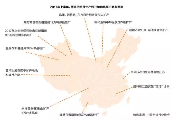 生產(chǎn)成本:多因素發(fā)力,下降明顯。在成本方面,光伏組件企業(yè)在2017年上半年延續(xù)了2016年的發(fā)展態(tài)勢(shì),其生產(chǎn)規(guī)模持續(xù)擴(kuò)大,技術(shù)不斷進(jìn)步,同時(shí)企業(yè)的布局也出現(xiàn)了西移的趨勢(shì),例如硅料生產(chǎn)環(huán)節(jié)由于耗能較大,很多企業(yè)都將新增的生產(chǎn)基地布局在了西北地區(qū)和西南地區(qū),這些地方由于能源資源比較豐富,電費(fèi)較低。在上述因素的共同作用下,光伏組件的成本持續(xù)下降,而這實(shí)際上也是支撐組件企業(yè)低價(jià)出口的一個(gè)重要因素。