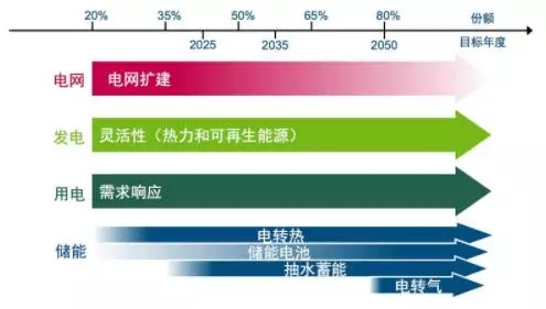 不同可再生能源比例下的關(guān)鍵靈活性技術(shù) 來(lái)源:BMU
