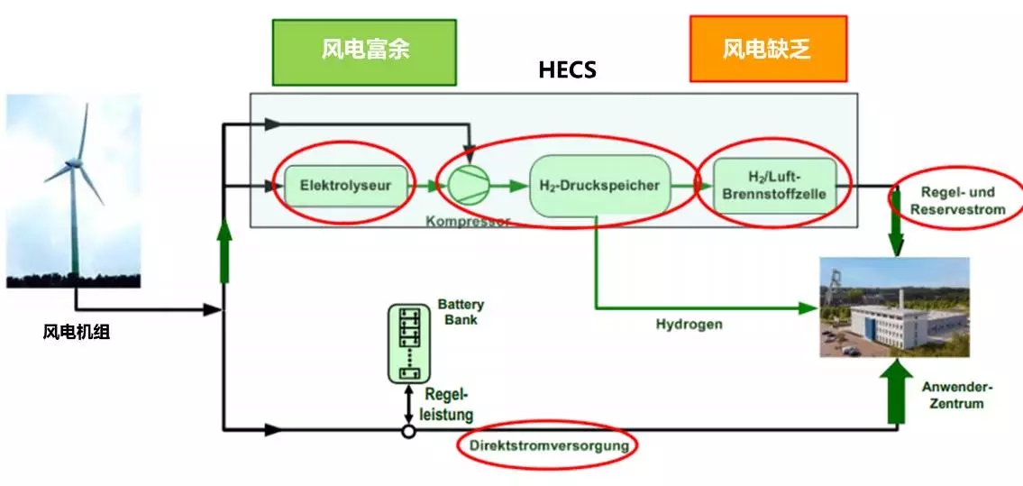 為了讓靠天吃飯的風(fēng)電能夠滿足地區(qū)供電的可靠性要求,該項(xiàng)目的核心為將多余的風(fēng)電用于電解生產(chǎn)氫氣,氫氣能夠很好地被儲(chǔ)存起來(lái),在缺電的時(shí)候通過燃料電池重新轉(zhuǎn)化為電力。這個(gè)流程被定義為:以氫能為基礎(chǔ)的能源補(bǔ)充系統(tǒng)(HECS),其基礎(chǔ)框架如下: