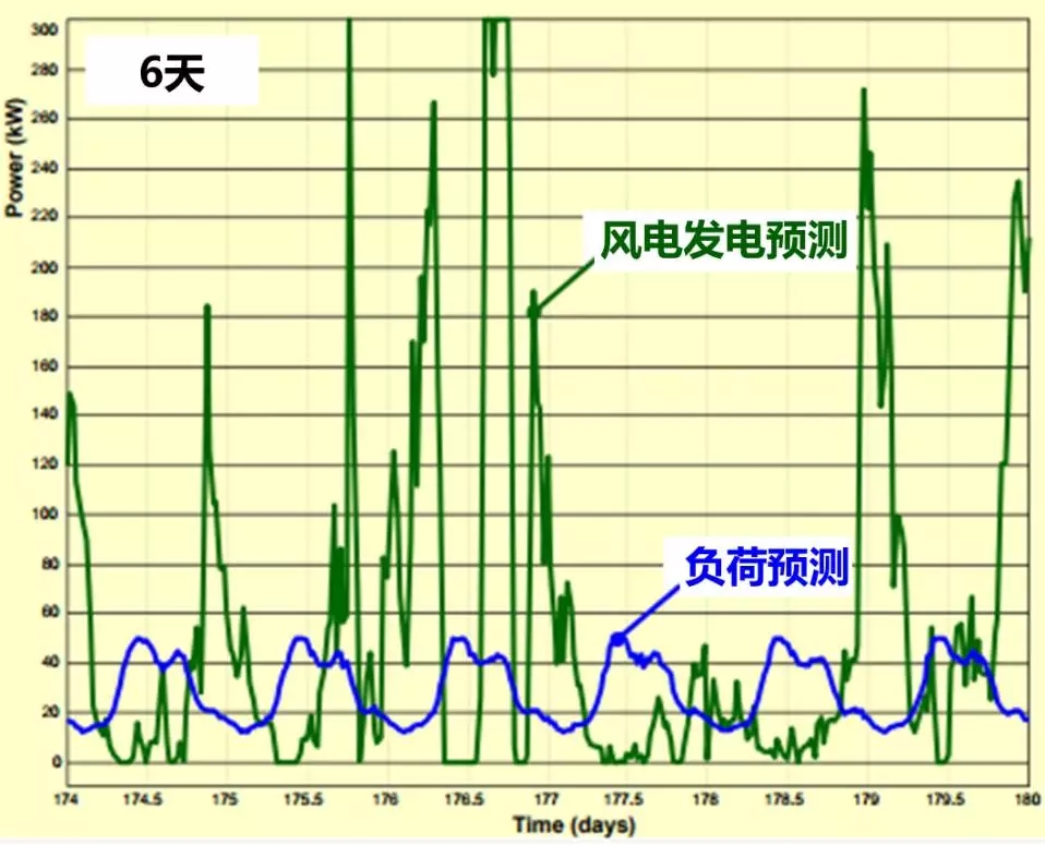 這個(gè)項(xiàng)目的HECS設(shè)備能夠提供每年250兆瓦時(shí)的電力和將近6500千克的氫氣。,一部分氫氣通過燃料電池為附近的一個(gè)辦公建筑提供足夠的電力,這棟建筑中午的峰值負(fù)荷能夠達(dá)到50KW,全年用電量在250兆瓦左右。為了能夠制定出最優(yōu)的風(fēng)電充放電策略,該系統(tǒng)配備了一套風(fēng)力發(fā)電預(yù)測(cè)系統(tǒng)和負(fù)荷預(yù)測(cè)系統(tǒng),一個(gè)通過該系統(tǒng)計(jì)算出的6天風(fēng)電發(fā)電功率和負(fù)荷的如下: