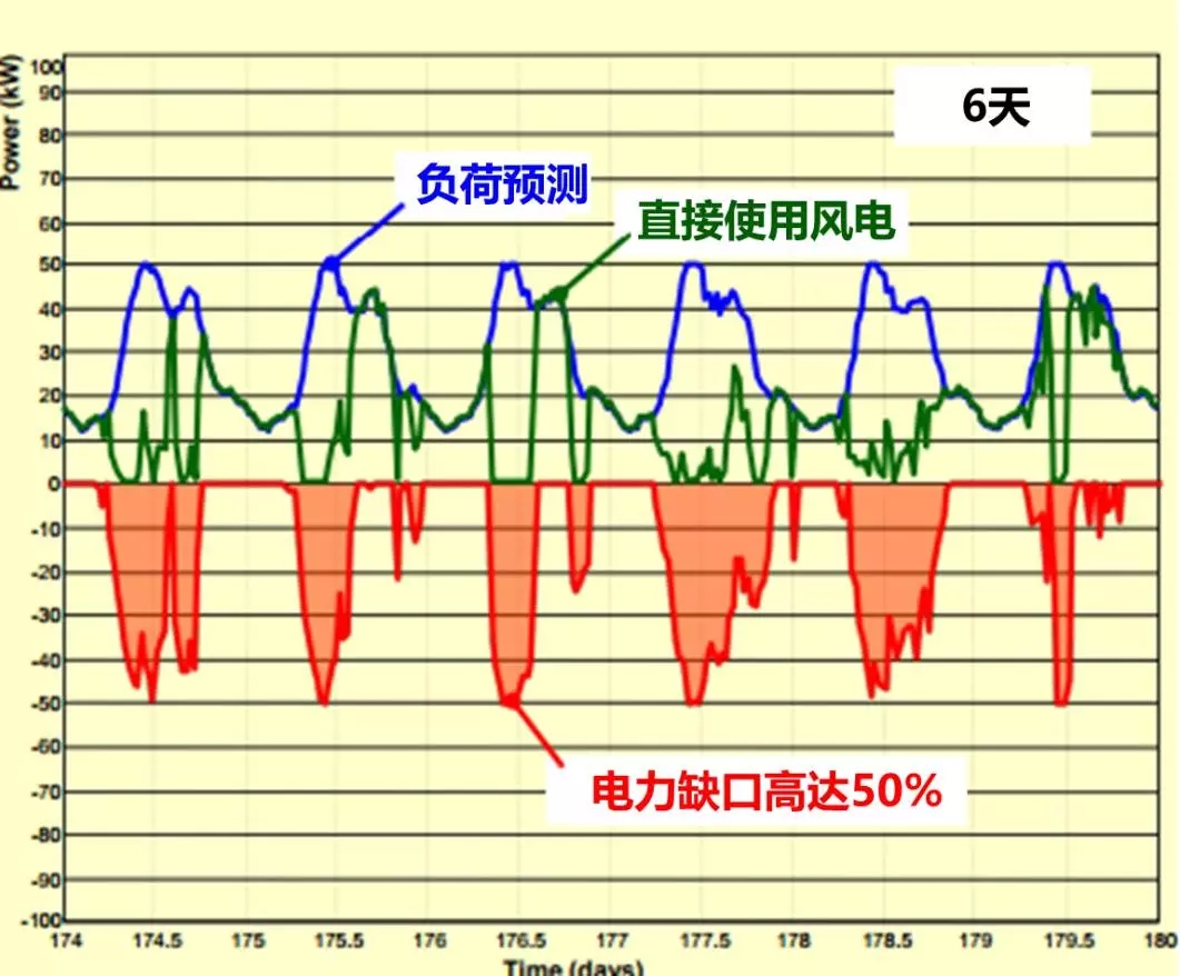 如果不加任何的儲(chǔ)能系統(tǒng),多余的風(fēng)電都要被放棄掉,在無(wú)風(fēng)或者少風(fēng)的時(shí)候甚至?xí)粘扇彪姷默F(xiàn)象,正午在用電高峰的時(shí)候風(fēng)電功率反而較低,以上6天在不加HECS系統(tǒng)情況下的情況如下圖: