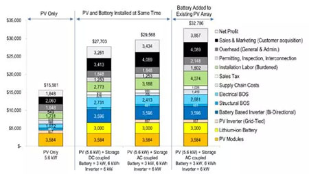 我們發(fā)現(xiàn),使用5.6千瓦太陽能光伏板和3千瓦/6千瓦時(shí)鋰離子電池的小型電池案例的基準(zhǔn)價(jià)格大約是單一的與電網(wǎng)相連的5.6千瓦太陽能光伏系統(tǒng)的2倍(詳情請(qǐng)參考圖1)。對(duì)新裝太陽能光伏+儲(chǔ)能系統(tǒng)而言,直流系統(tǒng)的價(jià)格(27,703美元)比交流系統(tǒng)的價(jià)格(29,568美元)低1,865美元。交流系統(tǒng)的價(jià)格溢價(jià)主要是由于交流配置所需的額外并網(wǎng)換流器造成的硬件和人工成本。然而,在對(duì)比交流與直流系統(tǒng)時(shí),安裝價(jià)格并不是唯一的考慮因素:交流系統(tǒng)在光伏能源即發(fā)即用的應(yīng)用中效率更高,而直流系統(tǒng)則在光伏能源儲(chǔ)存儲(chǔ)的應(yīng)用中更有效率。