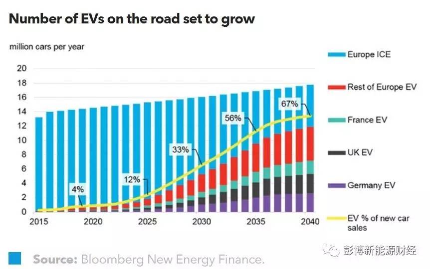 中國(guó)儲(chǔ)能網(wǎng)訊:歐洲各國(guó)與各大企業(yè)宣布大力投資發(fā)展電動(dòng)汽車已不是什么新鮮事兒了。瑞典汽車制造商沃爾沃(Volvo)于本周宣布,在2019年之后,該公司推出的新車產(chǎn)品,將僅限于混合動(dòng)力車或純電動(dòng)汽車。法國(guó)的環(huán)境部長(zhǎng)宣布,法國(guó)將努力在2040年之前達(dá)到禁止銷售以汽油與柴油為動(dòng)力汽車的目標(biāo)。在這一大背景下,彭博新能源財(cái)經(jīng)出版了最新的預(yù)測(cè)報(bào)告。在該報(bào)告中我們預(yù)測(cè):至2040年,歐洲新售車中將有67%的車為電動(dòng)車。