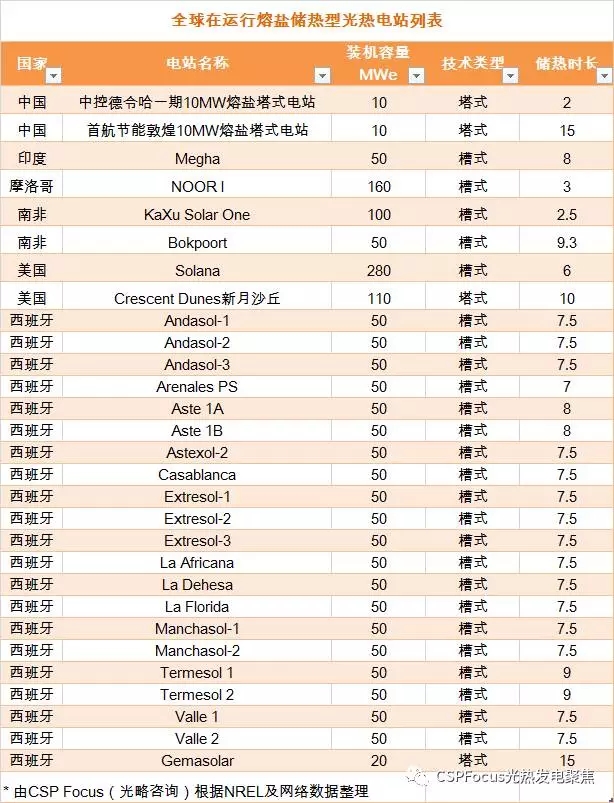 光熱電站儲熱類型多種多樣,除主流的熔鹽儲熱外,其他方法還包括水工質(zhì)、混凝土、砂石儲熱等。下表為全球在運行的熔鹽儲熱型光熱電站統(tǒng)計: