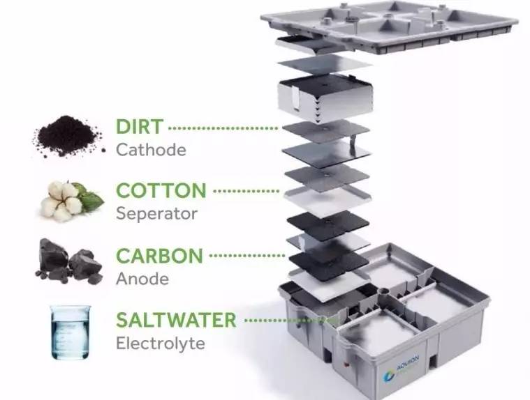 Aquion電池組件的構(gòu)成:陰極為土(含氧化錳),陽極為碳,電解液為鹽水來源:windpowerengineering.com