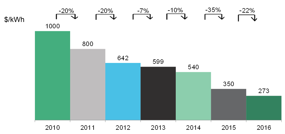 鋰電池成本從2010年以來已經(jīng)下降了72%來源:彭博新能源財經(jīng)