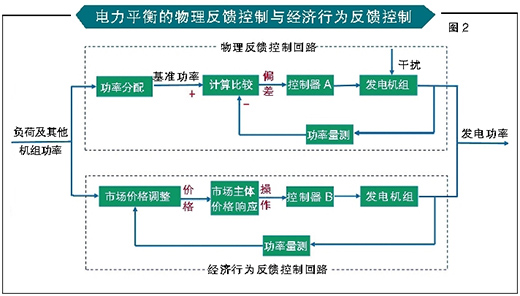 圖2中,物理反饋控制回路為純物理裝置的控制(可能包括必要的人工干預(yù)),通過比較發(fā)電機(jī)組實(shí)際發(fā)電功率與分配得的基準(zhǔn)功率之間的偏差,產(chǎn)生控制信號作用于控制器,并控制發(fā)電機(jī)組功率,響應(yīng)時(shí)間為秒級到分鐘級,響應(yīng)精確、靈敏、迅速。經(jīng)濟(jì)行為反饋控制回路主要是市場價(jià)格調(diào)整機(jī)制根據(jù)發(fā)電機(jī)組實(shí)際發(fā)電功率及其他信息獲得價(jià)格調(diào)整信號,市場主體基于價(jià)格信號作出行為響應(yīng),并通過物理控制器調(diào)整發(fā)電機(jī)組功率,由于此類反饋控制包括人的經(jīng)濟(jì)行為,具有不精確、不靈敏、反應(yīng)遲緩的特點(diǎn)。但在電力市場經(jīng)典理論中,兩類反饋控制長期被混為一談。