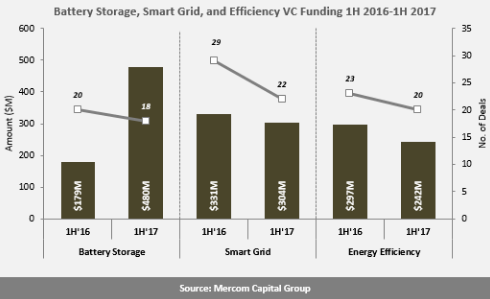 中國儲能網(wǎng)訊:據(jù)數(shù)據(jù)顯示,2017年上半年,全球智能電網(wǎng)、儲能和能效企業(yè)獲得風投資金(包括私募股權和企業(yè)風投)達到10.3億美元,同比增長25%。