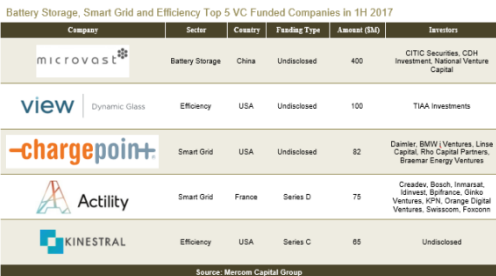 2017年上半年,智能電網(wǎng)企業(yè)獲得風投資金3.04億美元,涉及交易22個;去年同期為3.31億美元,涉及交易29個。單筆投資金額最大的是Actility獲得博世、KPN等多家公司累計7500萬美元投資。其次是西門子對ChargePoint投資4300萬美元。