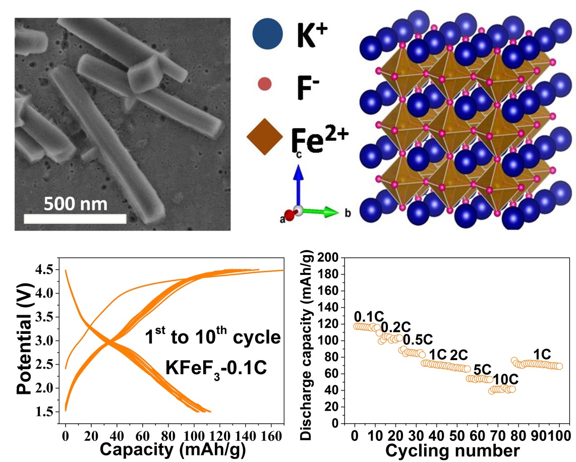 立方鈣鈦礦是近年來(lái)太陽(yáng)能電池、燃料電池和電催化的研究熱點(diǎn),但之前由于其密結(jié)構(gòu)特點(diǎn)很少被嘗試用作儲(chǔ)能電極。事實(shí)上,健壯構(gòu)架的鈣鈦礦相具有本征的三維擴(kuò)散通道,但是以前報(bào)道的NaFeF3中的Na填充通道較窄,導(dǎo)致Fe-F八面體晶格扭曲,使某些方向的通道變得更窄,影響其儲(chǔ)鈉高倍率的實(shí)現(xiàn)。為了實(shí)現(xiàn)鈣鈦礦相的規(guī)整化和開(kāi)框架化,該團(tuán)隊(duì)提出用等摩爾數(shù)的K+取代Na+作為通道填充劑,通過(guò)液相方法合成了一種立方相的KFeF3。KFeF3作為3V區(qū)間正極,實(shí)現(xiàn)了晶體結(jié)構(gòu)的高度對(duì)稱性和各向同性的三維快速離子通道,其表現(xiàn)出固溶反應(yīng)(近零應(yīng)力)的電化學(xué)行為和高的本征擴(kuò)散系數(shù)(7.9–9.8 × 10?11 cm2 s?1),從而使可逆儲(chǔ)鈉容量在0.1、2和10 C下分別可達(dá)110、70和40 mAh g?1,這也是目前所報(bào)道的氟化物儲(chǔ)鈉的最高倍率性能。同時(shí),該團(tuán)隊(duì)首次將這一氟化物作為鉀離子電池正極材料進(jìn)行測(cè)試,在0.5 C下有60mAh/g的穩(wěn)定放電容量。