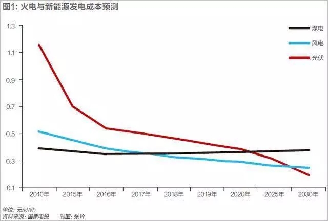 近年來,風、光發(fā)電的技術(shù)進步很快。單體風機的功率不斷增大,適應低風速發(fā)電的風機已推廣應用,太陽能電池和組件的轉(zhuǎn)換效率持續(xù)改進。與此同時,新能源的發(fā)電成本也在快速下降。風電設備和光伏組件的價格,在過去的五年里下降幅度分別超過了20%和60%。美國風電長期購電協(xié)議價格已與化石能源發(fā)電達到同等水平,德國新增的新能源電力基本實現(xiàn)與傳統(tǒng)能源平價。我國部分地區(qū)新能源的價格已經(jīng)與煤電價格相當,預計到2030年,光伏發(fā)電成本可以達到0.2元/千瓦時,風電達到0.22元/千瓦時(見圖表1)。