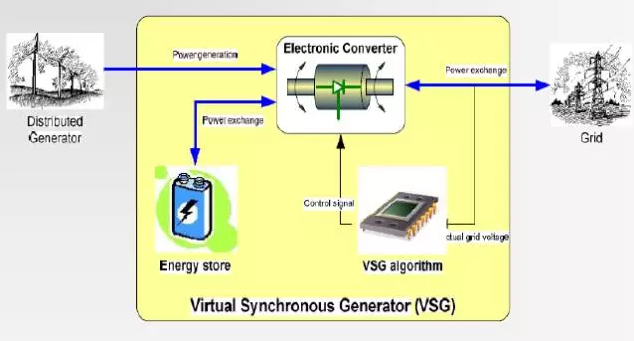 虛擬同步機(VSG)控制是一種基于同步發(fā)電機暫態(tài)模型的新型微電網(wǎng)逆變電源控制方法,借鑒同步發(fā)電控制中調(diào)速器和勵磁調(diào)節(jié)器的控制方法來設計變流器的控制器,使微源的輸出特性類似一個同步發(fā)電機系統(tǒng),對電力系統(tǒng)具有更加友好的并網(wǎng)特性,便于使用電力系統(tǒng)中成熟的方法對微源進行管理調(diào)度,同時外特性接近同步機,有利于電力系統(tǒng)的建模分析,避免了現(xiàn)在并網(wǎng)變流器模型多樣給電力系統(tǒng)分析帶來的困難。