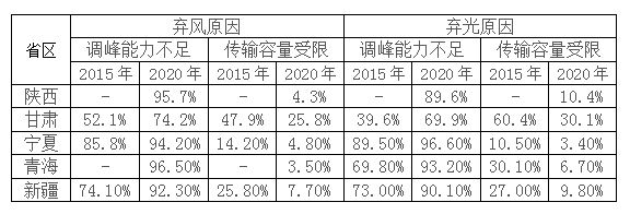 西北區(qū)域棄風(fēng)棄光的兩大主要原因?yàn)橄到y(tǒng)調(diào)峰能力不足和傳輸容量受限。由表3,隨著西北區(qū)域電源電網(wǎng)的發(fā)展,兩大原因?qū)夛L(fēng)棄光的影響占比正在發(fā)生變化。2015年調(diào)峰能力不足已是西北電網(wǎng)棄風(fēng)棄光的主導(dǎo)因素,但新能源傳輸容量受限問題依然不容忽視。2020年對(duì)于西北大部分省份來說,傳輸容量受限的導(dǎo)致棄風(fēng)棄光占比已經(jīng)很小,而調(diào)峰能力不足問題將會(huì)越來越嚴(yán)重。