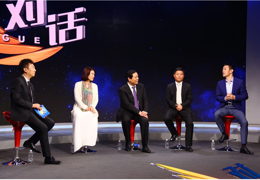 主持人陳偉鴻與對(duì)話嘉賓珠海格力電器股份有限公司董事長兼總裁董明珠、珠海銀隆新能源股份有限公司董事長魏銀倉現(xiàn)場交流。