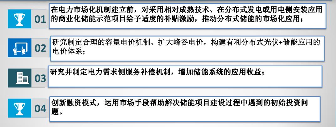 從推動(dòng)儲(chǔ)能技術(shù)商業(yè)化方面,我們給了一些相關(guān)建議。雖然國(guó)家能源局和發(fā)改委,從報(bào)告上面作出了一系列的支持政策,但是儲(chǔ)能都是包含在各項(xiàng)規(guī)劃政策當(dāng)中,沒(méi)有具體單獨(dú)性的政策。儲(chǔ)能的補(bǔ)貼政策沒(méi)有落地,所以我們認(rèn)為要借鑒一些國(guó)際經(jīng)驗(yàn),同時(shí)也要符合我們國(guó)家國(guó)情,來(lái)做一個(gè)適合推動(dòng)儲(chǔ)能產(chǎn)業(yè)發(fā)展的相關(guān)政策建議。