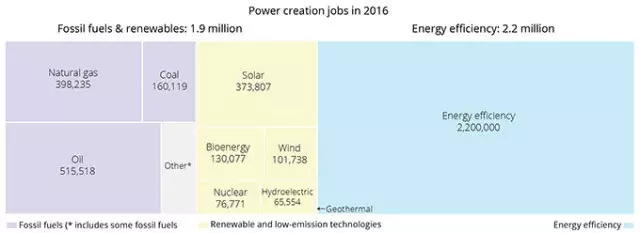 中國儲能網(wǎng)訊:紐約時報最近報道,太陽能行業(yè)從業(yè)人數(shù)已經(jīng)超過了煤炭行業(yè)。去年,煤炭行業(yè)創(chuàng)造的就業(yè)崗位為398,235個,而太陽能行業(yè)為373,807個,二者已經(jīng)基本持平。但是更為有趣的是,能源效率行業(yè)創(chuàng)造的就業(yè)崗位為2,200,000個,遠(yuǎn)遠(yuǎn)超過兩者之和。在基礎(chǔ)能源服務(wù)交付過程中,提取、轉(zhuǎn)換、運輸、傳輸和終端使用各個環(huán)節(jié)都會產(chǎn)生潛在的損耗。提升整體系統(tǒng)能源效率的機(jī)會存在于每一環(huán)節(jié)之中。如果能源服務(wù)交付更加高效,可再生能源便能夠在一次能源供給中發(fā)揮更大的作用。隨著可再生能源的比例增加,提供同等水平的能源服務(wù)所需的一次能源就相應(yīng)減少,從而最大程度地降低了整個系統(tǒng)的環(huán)境和經(jīng)濟(jì)成本。