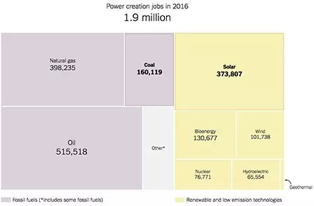 The New York Times recently reported that the solar industry now employs more people than the coal industry. It made the point well by featuring the accompanying graphic, based on Department of Energy data that track employment in various energy sectors:
