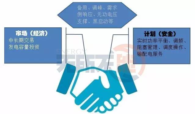 基于以上考慮,筆者認為在電力市場設(shè)計中的非商業(yè)性環(huán)節(jié),應(yīng)充分重視計劃方式(包括政府干預(yù)和電網(wǎng)的計劃管理)的作用,讓計劃這只“看得見的手”和市場這只“看不見的手”分工協(xié)作,取長補短,充分發(fā)揮我國電力行業(yè)公有制為主體和社會主義市場經(jīng)濟體制的優(yōu)越性,而非生搬硬套自由市場經(jīng)濟國家的市場模式(圖2)。具體來說,在安全性占主導(dǎo)的場合、自然壟斷和公共服務(wù)環(huán)節(jié),如實時電力平衡、調(diào)頻、阻塞管理、調(diào)度操作、輸配電服務(wù)等,適合引入計劃管理;在經(jīng)濟性占主導(dǎo)(效率優(yōu)先)的場合,如中長期交易、發(fā)電容量投資等,適合采用市場調(diào)節(jié);而有些環(huán)節(jié)則處于兩者之間,應(yīng)依具體情況而定,例如備用、調(diào)峰、需求側(cè)響應(yīng)、無功電壓支撐、黑啟動等。應(yīng)區(qū)分電網(wǎng)調(diào)度的決策權(quán)和執(zhí)行權(quán),市場改革要放開的是調(diào)度計劃的決策權(quán),而執(zhí)行權(quán)仍應(yīng)沿用多年來已證明為有效的統(tǒng)一管理模式。需要說明的是,筆者的意思絕非讓政府和電網(wǎng)隨意干預(yù)市場交易,而是確定各自的合理界限,涇渭分明,讓“上帝的歸上帝,凱撒的歸凱撒”。只有讓計劃管理做好公共服務(wù)、確保電網(wǎng)安全,才能讓市場交易更加自由和流暢,在資源配置中起決定性作用。此前筆者談到,英國電力市場從以日前交易為主的“全電量現(xiàn)貨”電力庫(pool)模式發(fā)展到以中長期雙邊交易(物理合同)為主的NETA、BETTA模式,并建立了復(fù)雜的平衡機制,市場主體在交易中不再受電網(wǎng)物理特性的局限,而可以更多地體現(xiàn)商業(yè)考慮,實現(xiàn)了物理(安全)與經(jīng)濟(商業(yè))的解耦,更多地還原了電力的商品屬性。在我國電力市場改革的初期,平衡機制甚至可以采用計劃調(diào)度方式來實現(xiàn),而非匆忙引入市場交易。如何確定計劃與市場的合理邊界,既防止計劃缺位和越位,又防止市場失靈,屬于經(jīng)濟學(xué)中的“哥德巴赫猜想”,需要在市場改革中不斷地進行實踐探索和理論總結(jié)。