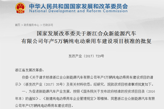 國家發(fā)展改革委關(guān)于浙江合眾新能源汽車