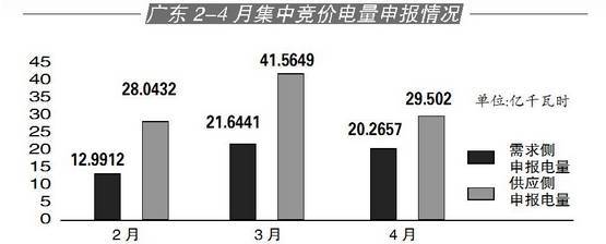 新規(guī)則約束了申報電量對成交價差的影響,也對電量供需比例做出了調(diào)整。廣東3月參與競價的電量供需比為2:1,2月則為2.16:1,而4月競價的供需比被調(diào)整為1.5:1,從參與競爭的電量上緩和了供需矛盾。4月集中競價中,供應側(cè)總申報電量為295020.3萬千瓦時,需求側(cè)總申報電量202656.9萬千瓦時。