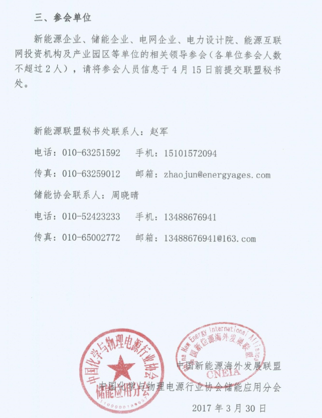 新能源企業(yè)、儲(chǔ)能企業(yè)、電網(wǎng)企業(yè)、電力設(shè)計(jì)院、能源互聯(lián)網(wǎng)投資機(jī)構(gòu)及產(chǎn)業(yè)園區(qū)等單位的相關(guān)領(lǐng)導(dǎo)參會(huì)(各單位參會(huì)人數(shù)不超過2人),請(qǐng)將參會(huì)人員信息于4月15日前提交聯(lián)盟秘書處。