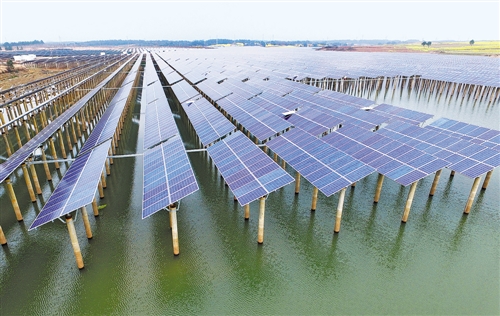 這是3月16日拍攝的江西奉新“漁光互補(bǔ)”光伏發(fā)電一期項(xiàng)目。近日,坐落于江西省宜春市奉新縣躍進(jìn)水庫上的泰明“漁光互補(bǔ)”光伏發(fā)電項(xiàng)目一期35兆瓦光伏電站建成投運(yùn)。該項(xiàng)目總投資12億元,總裝機(jī)容量110兆瓦,上層用于光伏發(fā)電,下層用于水產(chǎn)養(yǎng)殖,提高了單位面積土地和水域的經(jīng)濟(jì)價(jià)值。 新華社記者