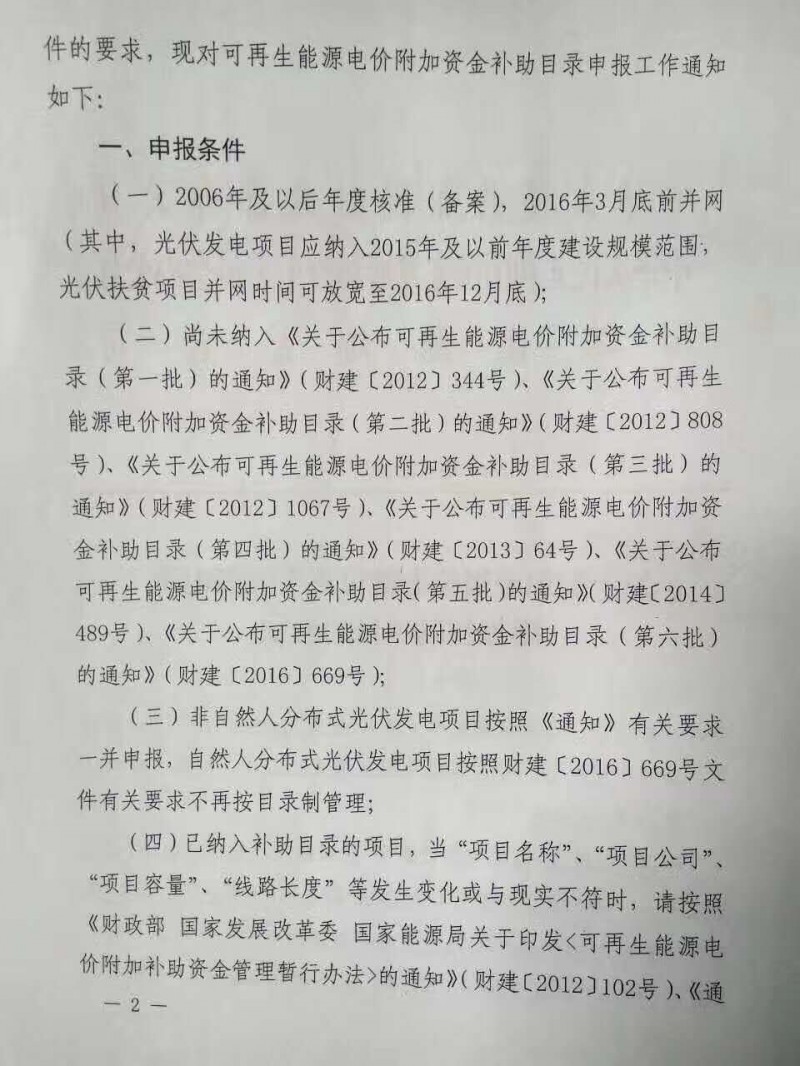 根據(jù)《財(cái)政部 國(guó)家發(fā)展改革委 國(guó)家能源局關(guān)于印發(fā)<可再生能源電價(jià)附加補(bǔ)助資金管理暫行辦法>的通知》(財(cái)建﹝2012﹞102號(hào))、《財(cái)政部關(guān)于分布式光伏發(fā)電實(shí)行按照電量補(bǔ)貼政策等有關(guān)問題的通知》(財(cái)建〔2013〕390號(hào),以下簡(jiǎn)稱《通知》)等有關(guān)文件的要求,現(xiàn)對(duì)可再生能源電價(jià)附加資金補(bǔ)助目錄申報(bào)工作通知如下: