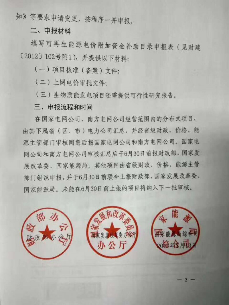 在國(guó)家電網(wǎng)公司、南方電網(wǎng)公司經(jīng)營(yíng)范圍內(nèi)的分布式項(xiàng)目,由其下屬省(區(qū)、市)電力公司匯總,并經(jīng)省級(jí)財(cái)政、價(jià)格、能源主管部門審核同意后報(bào)國(guó)家電網(wǎng)公司和南方電網(wǎng)公司。國(guó)家電網(wǎng)公司和南方電網(wǎng)公司審核匯總后于6月30日前報(bào)財(cái)政部、國(guó)家發(fā)展改革委、國(guó)家能源局;其他項(xiàng)目由省級(jí)財(cái)政、價(jià)格、能源主管部門組織申報(bào),并于6月30日前聯(lián)合上報(bào)財(cái)政部、國(guó)家發(fā)展改革委、國(guó)家能源局。未能在6月30日前上報(bào)的項(xiàng)目將納入下一批審核。