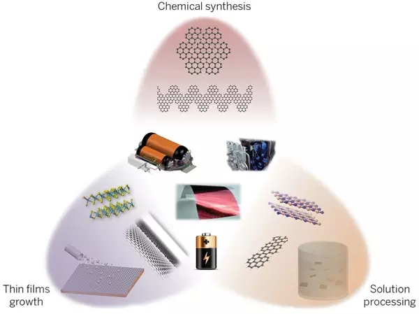 在光伏器件、燃料電池、電池、 超級電容器等中石墨烯的集成,為不斷增加的全球能源驅(qū)動的需求設備提供了機遇和應對挑戰(zhàn)。石墨烯天然的二維特性具有超高的比表面積,可達2200m2/g,同時也兼顧有高導電性和柔性,使石墨烯成為電荷儲存、離子儲存和氫氣儲存的有效材料。其他二維晶體,比如過渡金屬硫族化合物(TMDs)和過渡金屬氧化物,也成為能源應用很有前景的選擇。使用二維晶體這樣的優(yōu)勢,采用旋凃過程或者疊層組裝方法,有可能根據(jù)“需求”創(chuàng)造和設計出分層人工結(jié)構(gòu)。