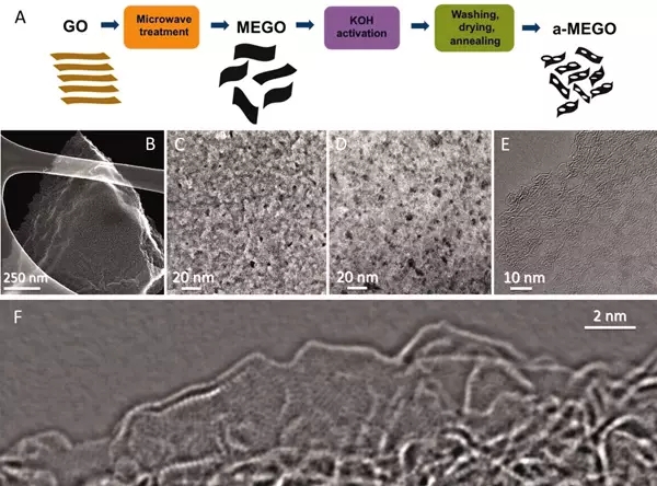 超級電容器在廣泛使用的過程中由于其低能量密度和相對較高的有效的串聯(lián)電阻而受到限制,使用電化學活化方法來剝離石墨烯,研究者們合成了一種比表面積高達3100m2/g的多孔碳,這種材料具有高的導電率和低的氧氫含量,靠sp2鍵結(jié)合的碳具有連續(xù)且高度彎曲的三維網(wǎng)狀結(jié)構(gòu),原子層墻最初的形成厚度為0.6-5納米寬度的孔隙,使用這種碳材料組裝的兩電極超級電容器有著高的質(zhì)量電容和高能量密度,而且文章中的方法甚至可以發(fā)展到產(chǎn)業(yè)化中。