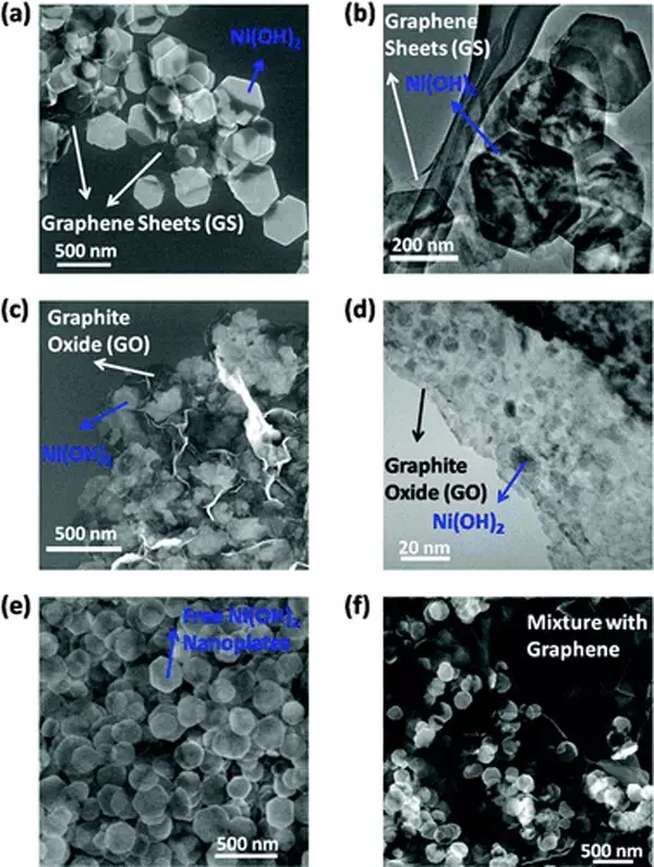 Ni(OH)2納米晶體上生長不同氧化程度的石墨烯片層作為電化學贗電容材料是一種十分有潛力的儲能應用材料。單晶Ni(OH)2六邊形納米片直接生長在輕度氧化、表面導電的石墨烯片層上,復合材料顯示出高的比電容約為1335F/g和優(yōu)異的循環(huán)性能。高的比電容和快速的充放電能力很有前途應用于能量密度和功率密度超高的超級電容器。預制備Ni(OH)2六邊形納米片和石墨烯進行一個簡單的物理混合顯示出較低的比電容,凸顯出直接在石墨烯納米材料的重要性,賦予了活性納米材料和導電石墨烯網(wǎng)絡之間緊密的相互作用和有效電荷傳輸。單晶Ni(OH)2六邊形納米片直接生長在石墨烯片層上的性能要優(yōu)于在小的Ni(OH)2納米顆粒上生長高度氧化的、電絕緣的網(wǎng)狀石墨烯。
