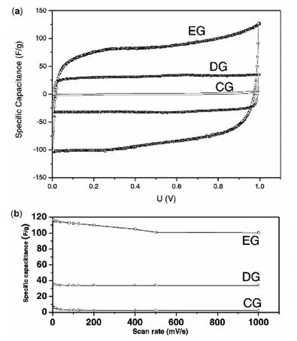 2008年,Vivekchand等人首次將石墨烯作為超級電容器電極材料。文章介紹了由三種不同的方法制備石墨烯作為電化學超級電容器的電極材料。制備的石墨烯比表面為925 m2/g,在1.0 mol/L H2SO4中,其比容量為117 F/g,當以電壓窗口較寬離子液體N-甲基丁基吡咯烷二(三氟甲基磺酰)亞胺鹽(PYR14TFS)為電解質(zhì)時,其比容量和能量密度分別為71 F/g和31.9 Wh/kg。
