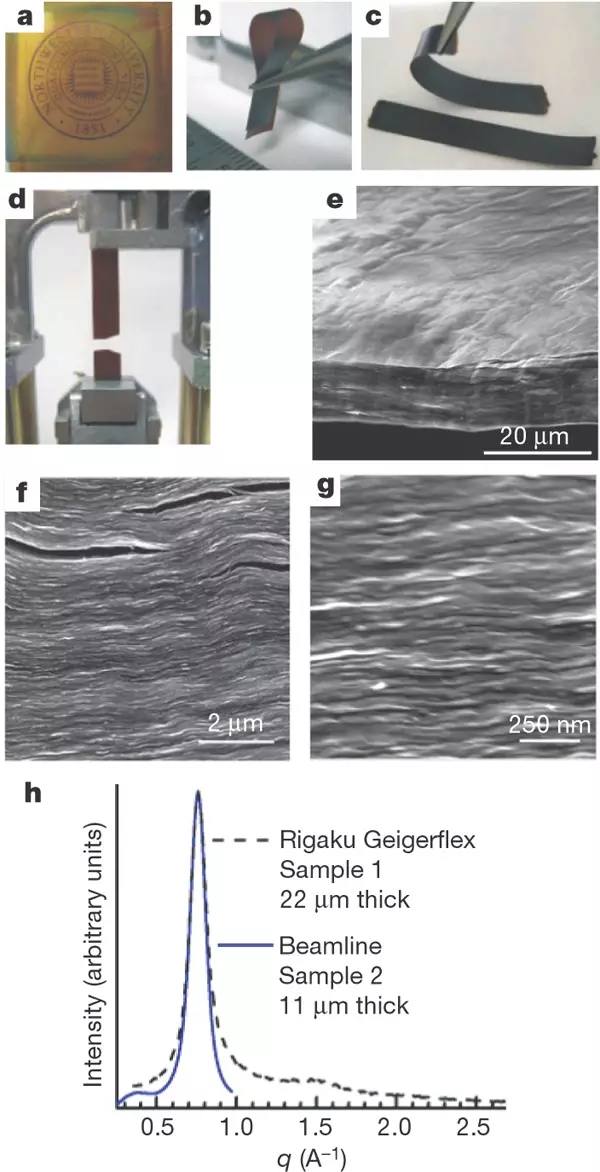 自支撐的紙型和薄膜型材料已經(jīng)是當今社會技術(shù)中的一部分,它們可以應用在保護圈、化學濾器、電池和超級電容器的組分、粘結(jié)層以及分子存儲等方面,納米級的無機紙型材料(比如剝離的蛭石和云母板)已經(jīng)受到很多關(guān)注,而且已經(jīng)作為保護涂料、高溫粘結(jié)劑、介質(zhì)阻擋和氣體防滲膜等材料商業(yè)化。來源于巴奇紙的碳納米管顯示出優(yōu)異的機械和電子性能,使它可能應用于燃料電池和結(jié)構(gòu)復合物。文章報道了一種氧化石墨烯紙的制備和表征,這種氧化石墨烯紙是單個氧化石墨烯片層定流控制制備的碳基膜材料。這種新型材料在剛度和強度上超過其他很多紙型材料,這種材料結(jié)合了宏觀上剛性和柔性兩種優(yōu)點,紙型的片層之間有很大的表面相互作用力,其褶皺也處于原子級別,褶皺形態(tài)處于亞微米級別,這些條件使材料的宏觀樣品具有高效的載荷分布,也使材料相比于傳統(tǒng)的碳基、黏土基紙更有彈性。類似于氧化石墨烯的廉價原始材料促進了大面積紙型片層的制備,同時可以應用于可控滲透過濾膜、各向異性離子導體、超級電容器、分子儲存材料等。石墨烯氧化紙也可以摻雜或作為物質(zhì)載體制備含有聚合物、陶瓷和金屬的混合材料。另外,分層的氧化石墨烯片層表面有許多化學官能團使材料具有更多功能。