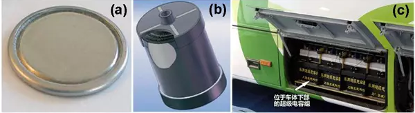 圖1 商業(yè)超級電容器實物圖(a, b),混合動力汽車中的超級電容器電源(c)