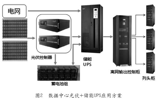 數(shù)據(jù)中心光伏+儲(chǔ)能UPS應(yīng)用方案如圖2所示,它是在現(xiàn)有的儲(chǔ)能UPS方案上增加了光伏,即在白天光照最好的時(shí)候,通過光伏控制器給蓄電池進(jìn)行充電。