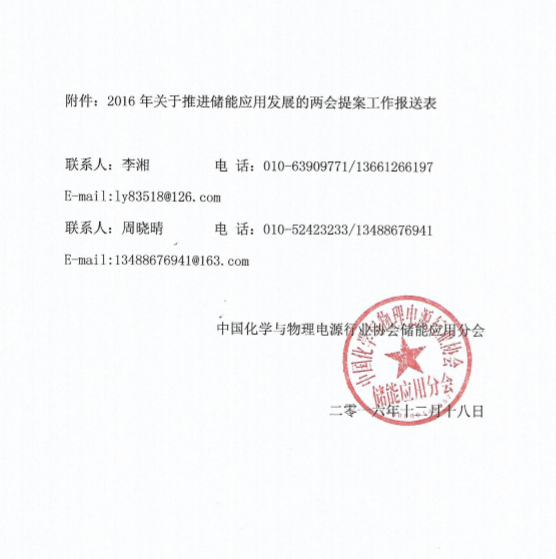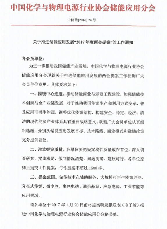 請各單位于2017年1月20日前將提案稿及報送表(電子版)報送中國化學(xué)與物理電源行業(yè)協(xié)會儲能應(yīng)用分會秘書處。