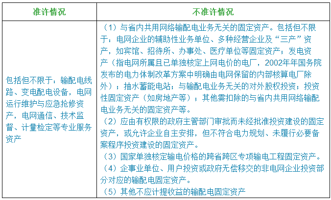 定價(jià)辦法對(duì)于準(zhǔn)許收益規(guī)定“準(zhǔn)許收益=可計(jì)提收益的有效資產(chǎn)×準(zhǔn)許收益率,可計(jì)提收益的有效資產(chǎn),是指電網(wǎng)企業(yè)投資形成的,為提供共用網(wǎng)絡(luò)輸配電服務(wù)所需的,允許計(jì)提投資回報(bào)的輸配電資產(chǎn),包括固定資產(chǎn)凈值、無(wú)形資產(chǎn)凈值和營(yíng)運(yùn)資本?!睂?duì)于可計(jì)提收益的固定資產(chǎn),定價(jià)辦法對(duì)準(zhǔn)許和不準(zhǔn)許情況給出如下界定: