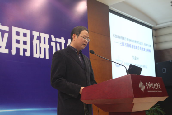 中科院合肥物質(zhì)科學(xué)研究院副研究員劉金云博士以“石墨烯基鋰離子電池材料研究與應(yīng)用”為題,介紹了鋰離子電池存在的問題和主要挑戰(zhàn),以及國內(nèi)外三維石墨烯基復(fù)合電池材料的研究工作?!叭S石墨烯電導(dǎo)率高,質(zhì)量輕,孔隙率高,比表面積大,三維框架結(jié)構(gòu)機(jī)械性能好,具有力學(xué)柔性。三維結(jié)構(gòu)利于表/界面化學(xué)反應(yīng),機(jī)械形變緩沖,離子擴(kuò)散與電子轉(zhuǎn)移,可減小粘結(jié)劑等添加劑的影響。”