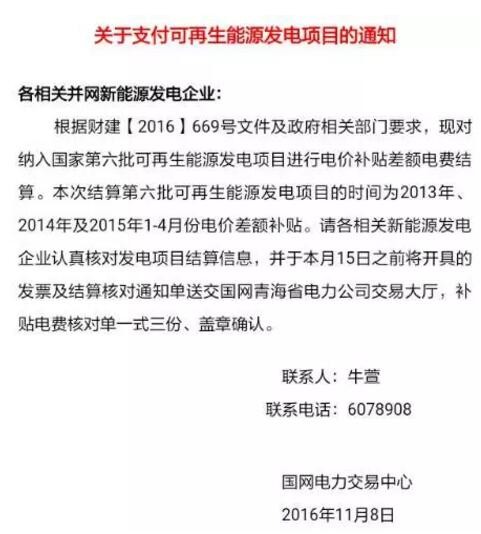 中國(guó)儲(chǔ)能網(wǎng)訊:11月8日,國(guó)家電力交易中心向青海新能源企業(yè)下發(fā)的《關(guān)于支付可再生能源發(fā)電項(xiàng)目的通知》(下稱“通知”)明確,計(jì)劃對(duì)納入國(guó)家第六批可再生能源發(fā)電項(xiàng)目進(jìn)行電價(jià)補(bǔ)貼差額電費(fèi)結(jié)算。同時(shí)《通知》要求,相關(guān)新能源企業(yè)在11月15日前將開(kāi)具的發(fā)票及結(jié)算核對(duì)通知單送交青海國(guó)網(wǎng)交易大廳。