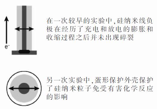 硅納米線和微型蛋形結(jié)構(gòu),前者在吸收和釋放鋰離子時(shí)會(huì)膨脹和收縮,后者帶有“碳?xì)ぁ?,可保護(hù)含有鋰離子的硅顆?!暗包S”。