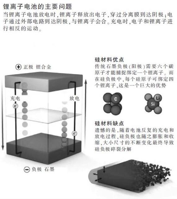 利用硅材料制造負(fù)極很簡(jiǎn)單,問(wèn)題在于這種負(fù)極無(wú)法持續(xù)穩(wěn)定地存在。電池充電時(shí),鋰離子大量涌入并與硅原子結(jié)合,負(fù)極材料可膨脹300%,然后在放電過(guò)程中,隨著鋰離子的流出,負(fù)極材料迅速收縮。硅電極經(jīng)不起幾次折騰就會(huì)斷裂,分裂成細(xì)小的顆粒。電池的負(fù)極,或者說(shuō)整個(gè)電池就這樣報(bào)廢了。