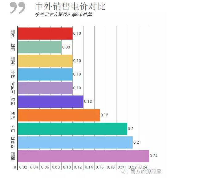 從銷售電價總水平看,按美元對人民幣匯率6.6換算,中國銷售電價總水平約為每千瓦時0.10美元,高于越南(0.08美元),與美國、南非、土耳其等國家基本持平,低于巴西(0.12美元)、法國(0.15美元)、日本(0.20美元)、菲律賓(0.21美元)、德國(0.24美元)等國家。