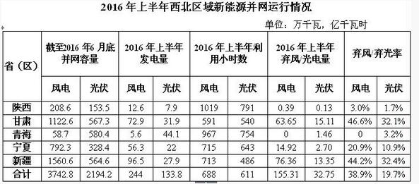 2016年上半年,西北五省(區(qū))新增光伏發(fā)電并網(wǎng)容量178.7萬(wàn)千瓦,截至6月底,累計(jì)并網(wǎng)容量2194.2萬(wàn)千瓦,占全網(wǎng)總裝機(jī)的11.0%。上半年,光伏發(fā)電量133.8億千瓦時(shí),占全網(wǎng)總發(fā)電量的4.5%;利用小時(shí)數(shù)611小時(shí),棄光電量32.8億千瓦時(shí),棄光率19.7%。西北五省(區(qū))中,新疆、甘肅光伏發(fā)電運(yùn)行較為困難,棄光率為32.4%和32.1%。此外,寧夏棄光率10.9%,青海棄光率3.2%,陜西首次發(fā)生棄光限電情況,棄光率為1.7%。