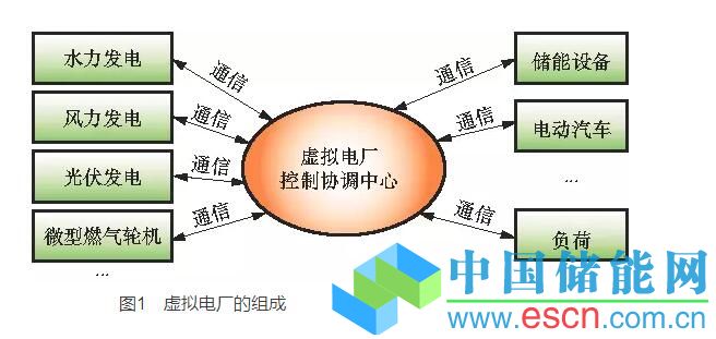 虛擬電廠的提出是為了整合各種分布式能源,包括分布式電源、可控負(fù)荷和儲能裝置等。其基本概念是通過分布式電力管理系統(tǒng)將電網(wǎng)中分布式電源、可控負(fù)荷和儲能裝置聚合成一個虛擬的可控集合體,參與電網(wǎng)的運(yùn)行和調(diào)度,協(xié)調(diào)智能電網(wǎng)與分布式電源間的矛盾,充分挖掘分布式能源為電網(wǎng)和用戶所帶來的價值和效益。虛擬電廠主要由發(fā)電系統(tǒng)、儲能設(shè)備、通信系統(tǒng)構(gòu)成,見圖1。