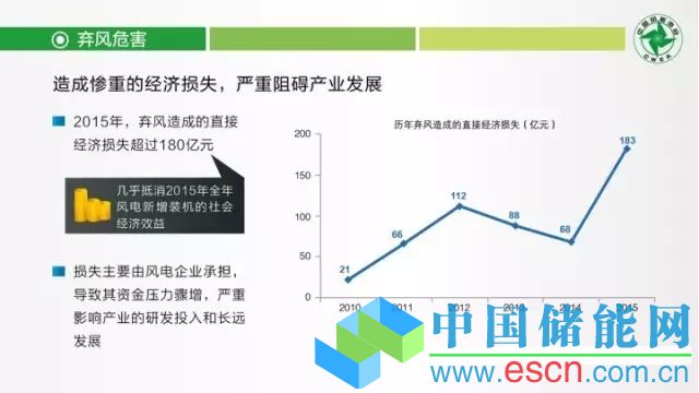 自2010年開始,棄風(fēng)問題愈演愈烈,全國平均棄風(fēng)率長期高于10%。2015年,這一數(shù)據(jù)攀升至15%。特別是入冬后,甘肅、寧夏、黑龍江等省區(qū)的一些風(fēng)電項目的棄風(fēng)率更是高達60%以上。棄風(fēng)限電帶來的最直接后果就是巨額的經(jīng)濟損失。經(jīng)測算,2010年至2015年,棄風(fēng)電量累計達到997億千瓦時,直接經(jīng)濟損失超過530億元。僅2015年的棄風(fēng)電量就達到339億千瓦時,直接經(jīng)濟損失超過180億元。