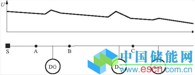 分布式電源的接入對饋線的電壓具有抬升作用,而且對于出力受自然因素影響的分布式電源(如光伏、風(fēng)電等),由于其波動(dòng)性還會產(chǎn)生電壓波動(dòng),并且對其接入點(diǎn)的電壓抬升作用和電壓波動(dòng)作用最大。對于接入多臺分布式電源的饋線,其沿線電壓分布就如同在各個(gè)分布式電源處分別由一個(gè)小棍頂著一般,在各個(gè)分布式電源的接入點(diǎn)形成一個(gè)個(gè)電壓極值點(diǎn),見圖1。圖中,S為該饋線的變電站出線斷路器,A、B和C為分段開關(guān),DG為分布式電源,曲線縱軸U 代表沿線電壓。