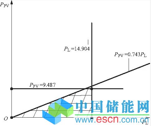 例如,對于一條負(fù)荷功率沿饋線遞增分布、分布式光伏電源容量沿饋線均勻分布的饋線,采用YJV-120型電纜,在容載比為75%的情況下,分布式光伏電源的允許接入容量范圍如圖3中陰影區(qū)域所示。圖中,PPV表示分布式電源的容量。由圖可見,即使不對分布式電源進(jìn)行控制,饋線對其的消納能力也很大。