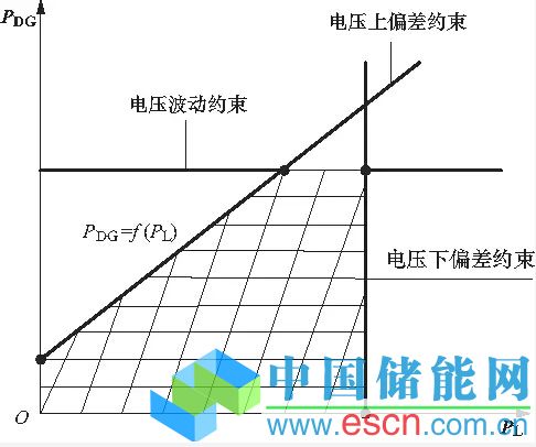 在不對分布式電源采取任何控制措施的條件下,分布式電源可接入容量必須同時(shí)滿足3個(gè)約束條件(即分布式電源接入配電網(wǎng)引起的最大電壓上偏差值與最大電壓波動(dòng)值不越限,以及無分布式電源接入配電網(wǎng)時(shí)單純由負(fù)載引起的最大電壓下偏差值不越限),這3條曲線共同圍成的陰影部分區(qū)域就是不對分布式電源采取任何控制措施的條件下分布式電源的可接入容量范圍,見圖2。圖中,PDG和PL分別表示分布式電源的容量和負(fù)荷功率。