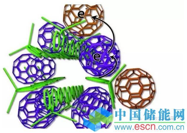 聚合物給體能夠吸收陽光并將電子傳遞給富勒烯,電能就是在這個過程中產(chǎn)生的。被稱為有機光伏的塑料材料的結(jié)構(gòu)通常像一盤煮過的意面那樣無序。細長的聚合物給體就像“意面”,富勒烯就像“肉丸”。這樣的結(jié)構(gòu)使得電流很難流出電池,因為有時電子會彈回聚合物“意面”后消失。新技術(shù)將這些成分有序排列——就像一把生意面和精確穿插其中的肉丸一樣。一些富勒烯“肉丸”在聚合物給體形成的環(huán)抱中,另一些則在外側(cè)。環(huán)抱中的富勒烯將電子從聚合物中分離然后“丟”給外側(cè)的富勒烯。